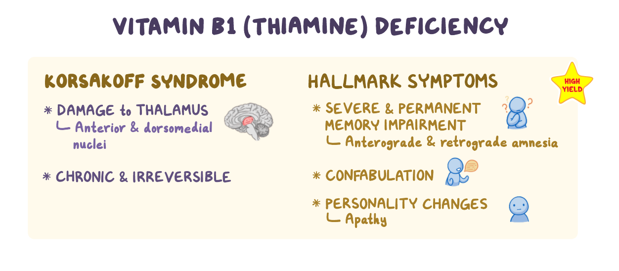 21. An 85-year-old man is brought in by his niece to the clinic after finding him confused outside his house. He denies the incident and says that he was “just walking his dog around the neighborhood” after having a meal with his friends. After the consultation, his niece states that “He doesn't own a dog, he lives alone, and most of his meals consist of reheating canned foods.” Past medical history includes hypertension, hypercholesterolemia and type 2 diabetes. Medications include hydrochlorothiazide, atorvastatin and metformin. Family history is noncontributory. He has been drinking 5-6 beers daily for the past 30 years. Temperature is 37.0°C (98.6°F), pulse is 92/min, respirations are 17/min, and blood pressure is 135/85 mmHg. He is oriented to place and person but not time. Immediate and delayed memory recall is poor. Pupils are equal and reactive, and horizontal nystagmus is elicited on lateral gaze. Fundoscopy is normal. There is no nuchal rigidity on examination. Motor strength is 5/5 in the upper extremities and 2/4 in bilateral lower extremities. Deep tendon reflexes of the knee and ankle are 1+ bilaterally. MRI reveals necrosis in the mamillary bodies and medial thalamus. Which of the following is the most likely diagnosis?
