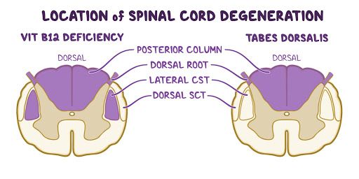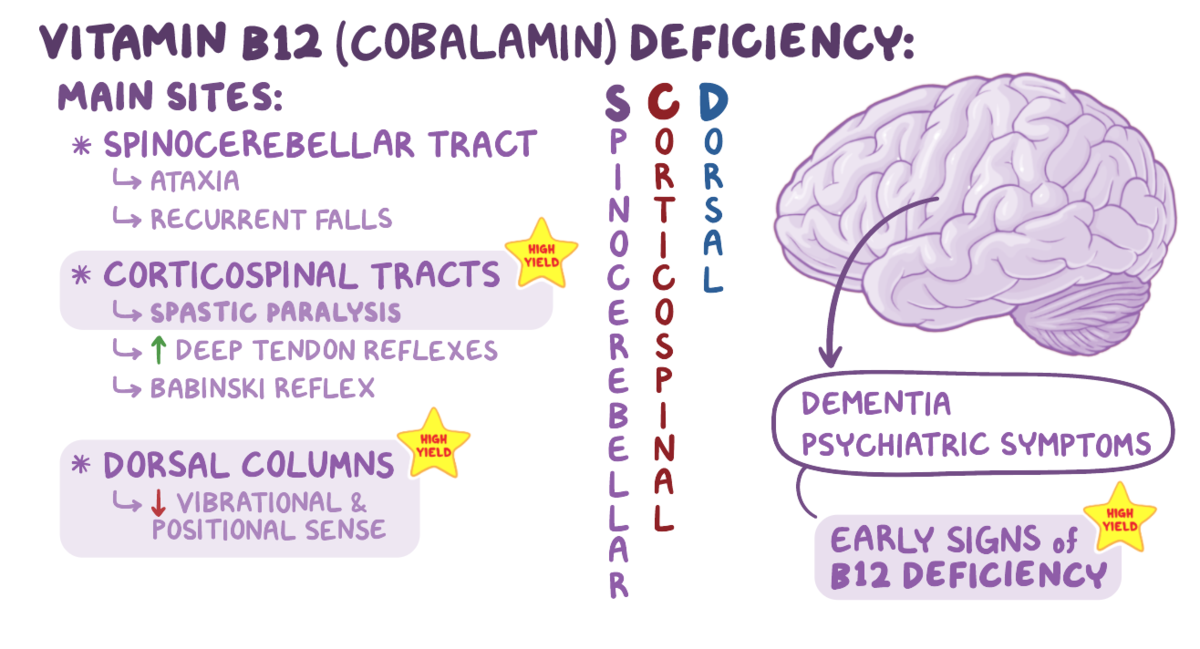 23. A 32-year-old woman comes to her primary care physician with worsening depression and frequent falls. She has had difficulty sleeping at night and has frequently been stumbling over herself while walking. The patient states “my legs feel numb all the time.” Her partner, who is also present during the visit, states that the patient has not been herself lately and has been eating less since her mother passed away. Past medical history is notable for Crohn disease, depression, and Graves disease. She drinks alcohol socially, occasionally smokes marijuana, and adheres to a vegan diet. Her temperature is 37.0°C (98.6°F), pulse is 67/min, respirations are 14/min, blood pressure is 110/74 mmHg, and O2 saturation is 98% on room air. Physical examination is notable for a sad affect, an ataxic gait, as well as paresthesias and hyperactive deep tendon reflexes in the lower extremities bilaterally. Laboratory testing reveals the following results: