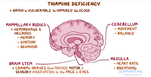 7. A 45-year-old man is brought to the emergency department by the local paramedics after he was found unconscious on the road side. The patient is covered in vomit, urine, and stool. The patient lives in a homeless shelter and has had several emergency department visits for alcohol intoxication. Past medical history is significant for chronic hepatitis C infection. Temperature is 37.2°C (99.0°F), pulse is 130/min, respirations are 19/min, and blood pressure is 114/64 mmHg. Physical examination shows hepatomegaly and dry scaly skin. Eye examination findings are shown below: