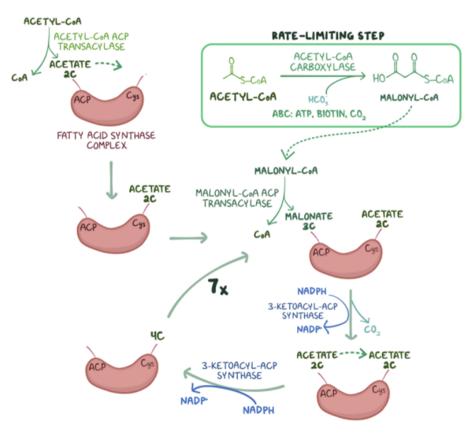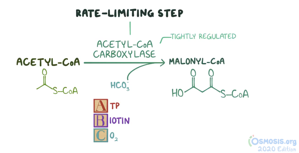 5. Biochemistry researchers are studying the pathway of fatty acid synthesis with students in the laboratory. Which of the following is the rate-limiting step of fatty acid synthesis?