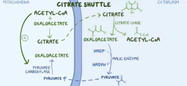 2. A group of students are studying the metabolic sites of major cellular processes. Which of the following steps in fatty acid synthesis is crucial to transport acetyl-CoA from the mitochondria to the cytoplasm?