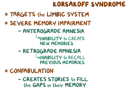 32. A 56-year-old individual presents to the emergency department after being found wandering the streets aimlessly. According to emergency services, the patient was uttering “nonsense” to bystanders on the street who then proceeded to call an ambulance. Chart review demonstrates the patient has a history of recurrent presentations to the emergency department for alcohol intoxication. Vital signs are within normal limits. On physical examination, the patient appears disheveled and provides minimal responses when asked how they arrived at the emergency department. Gait examination is normal. A blood alcohol level is undetectable, and a urine drug screen is within normal limits. Head CT is noncontributory. Which of the following clinical manifestations is most characteristic of this condition?