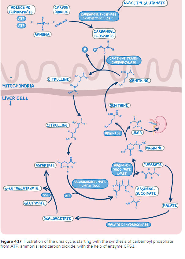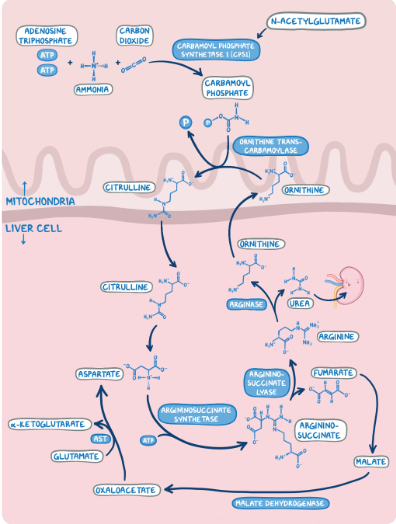 3. Biochemistry researchers are studying the metabolic pathway involved in the removal of toxic ammonia molecules. Which of the following reactions of these metabolic pathways occurs in the mitochondria?