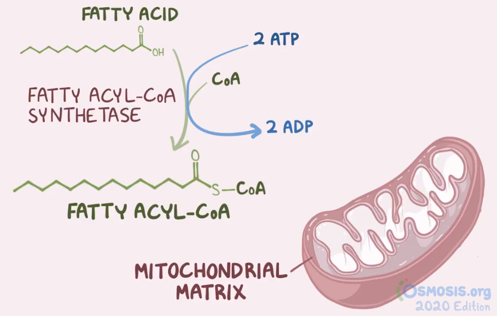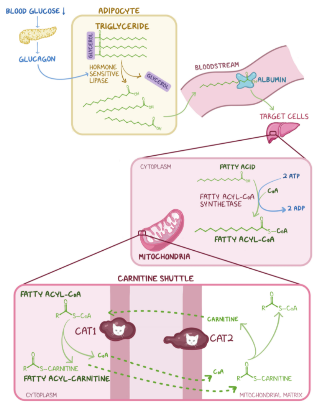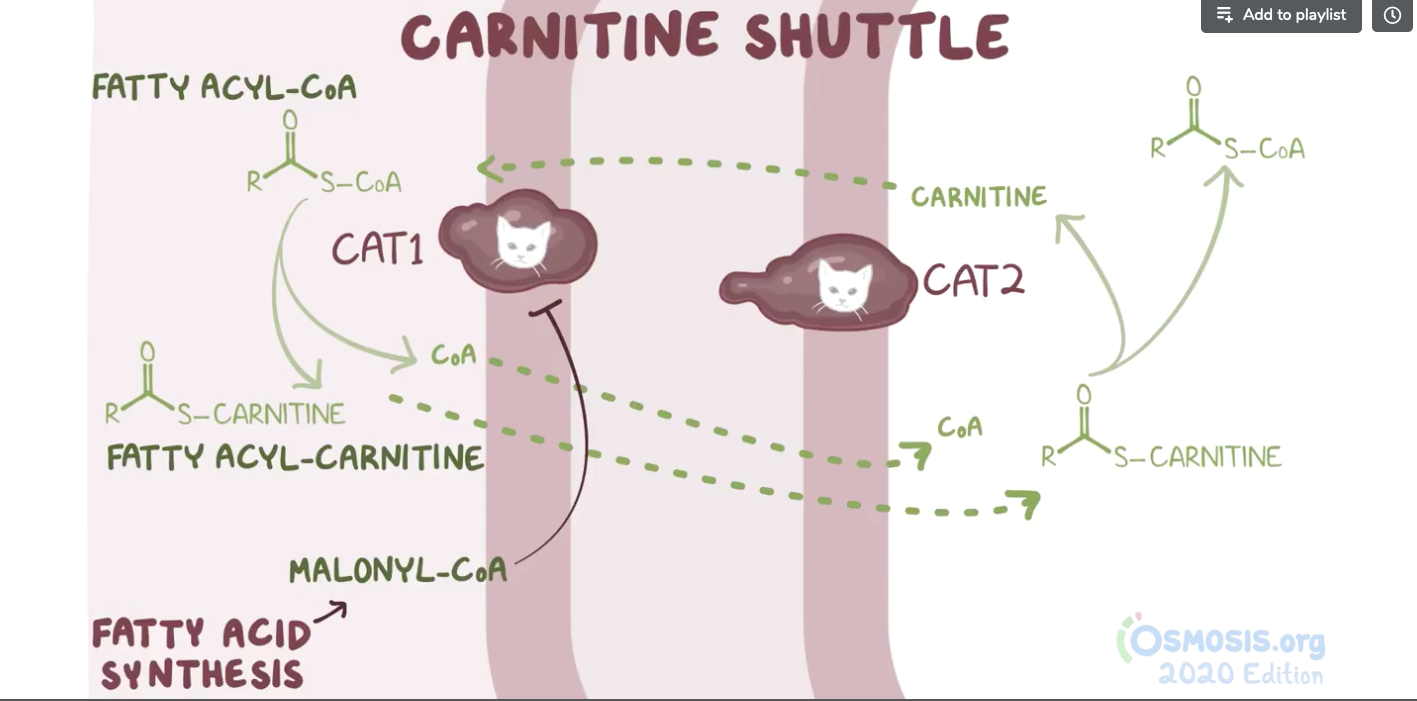 7. A group of students are studying the metabolic sites of major cellular processes. Which of the following best describes the mechanism by which long-chain fatty acids are transported into the mitochondrial matrix for the purpose of β-oxidation and energy production?