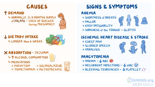 3. A 25-year-old woman comes to the clinic with generalized fatigue over the last 2 months. She has noticed an inability to concentrate and has recently noticed she becomes short of breath after climbing 3 sets of stairs to her apartment. She denies being depressed or having suicidal thoughts. Five months ago, she was initiated on phenytoin after 2 episodes of generalized tonic-clonic seizures. She recently initiated a high-protein diet consisting mainly of meat and animal products with minimal vegetables. Temperature is 37.0°C (98.6°F), pulse is 96/min, respirations are 20/min, and blood pressure is 125/85 mmHg. BMI is 23 kg/m2. Physical examination is within normal limits. Thyroid function tests are normal. Laboratory testing reveals a hemoglobin of 9.3 g/dL. A peripheral blood smear is performed and shows the following: