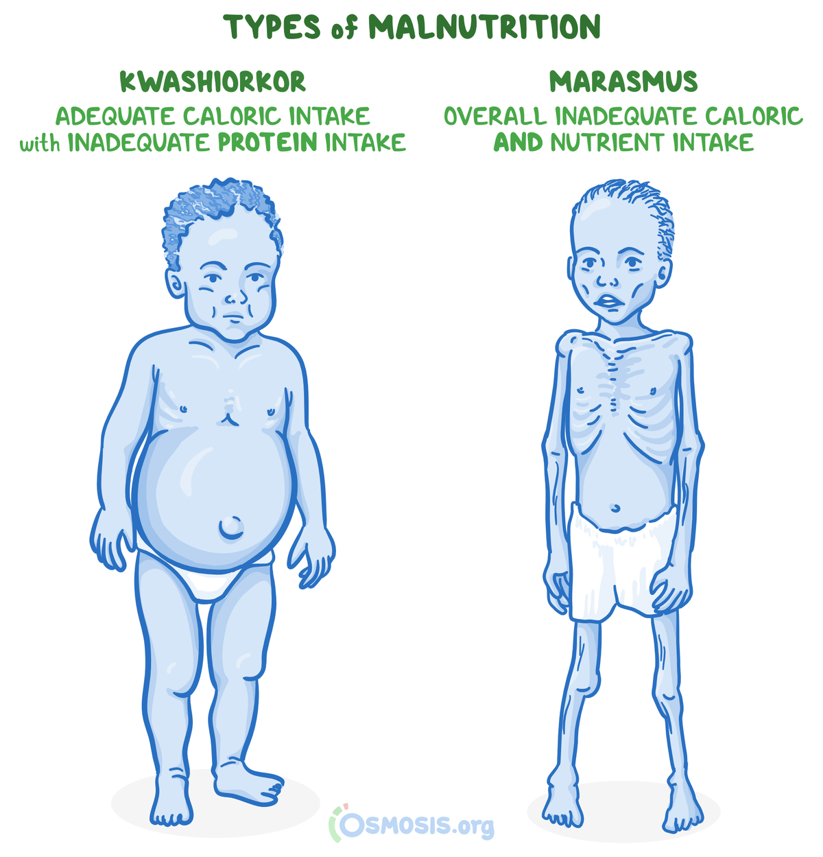 20. A 3-year-old boy in a refugee camp is brought to a volunteer clinic in sub-Saharan Africa with failure to thrive. His mother states he has been small since birth and has never seen a doctor. Height and weight are at the 5th percentile. On physical exam, he is very lethargic and severely emaciated with redundant skin folds. He is noted to have little subcutaneous fat. He is admitted for supportive treatment. Which of the following best describes the pathophysiology of this patient’s condition?