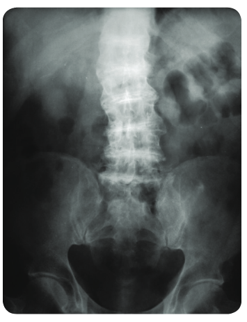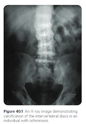 24 Qs1. A 50-year-old man comes to the clinic for evaluation of chronic back pain. He works as a librarian and notes that the pain is localized to his lower back and worsens after a long day of standing. The pain has not improved despite treatment with ibuprofen. Past medical history is significant for osteoarthritis of his right hip, for which he underwent a total hip replacement 2 years ago. Family history is noncontributory. Temperature is 37.0°C (98.6°F), pulse is 86/min, respirations are 16/min, and blood pressure is 125/85 mmHg. Ophthalmic examination reveals a bluish pigment deposition in the sclera. Dermatological examination reveals hyperpigmentation in the axillary and inguinal regions. Range of motion at the spine is limited. An x-ray of the erect spine is shown below: