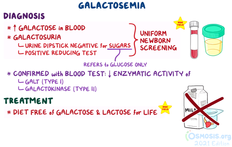 9. A 1-month-old infant is brought to the emergency department because of failure to thrive and recurrent vomiting. The patient was born full-term at home via an uncomplicated vaginal delivery. Shortly after birth, the patient began experiencing nausea and vomiting after feedings. The patient was at the 50th percentile for weight at birth. At today’s visit, the patient is at the 25th percentile. Temperature is 36.9°C (98.4°F), pulse is 108/min, blood pressure is 77/40 mmHg, and respiratory rate is 56/min. Physical examination reveals jaundice and hepatomegaly. Fundoscopic examination reveals bilateral clouding of the lens. Urine dipstick is negative for glucose. Additional testing reveals the presence of reducing substances in the urine. Which of the following is the most likely diagnosis?