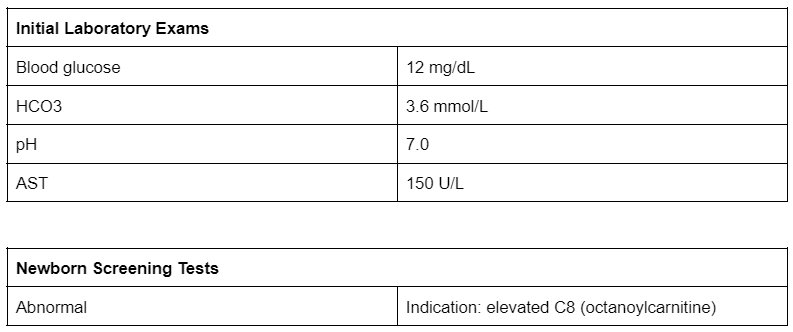 11. A 6-day-old infant is brought to a local emergency department after being found unresponsive by the patient’s parents. The neonate is promptly admitted to the NICU and is given D10 normal saline and a bicarbonate infusion. Overnight, the patient develops generalized seizure activity. An MRI performed the following day reveals hypoxic-ischemic encephalopathy. Initial laboratory findings and newborn screening results are demonstrated below. Which of the following is the most likely diagnosis?